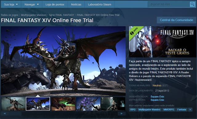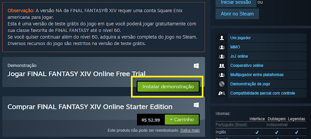 Para baixar o jogo entre no app da STEAM logado (se não tiver conta no site, crie uma), procure o jogo Final Fantasy XIV Online Free Trial, desça a página e clique em “Instalar demonstração”