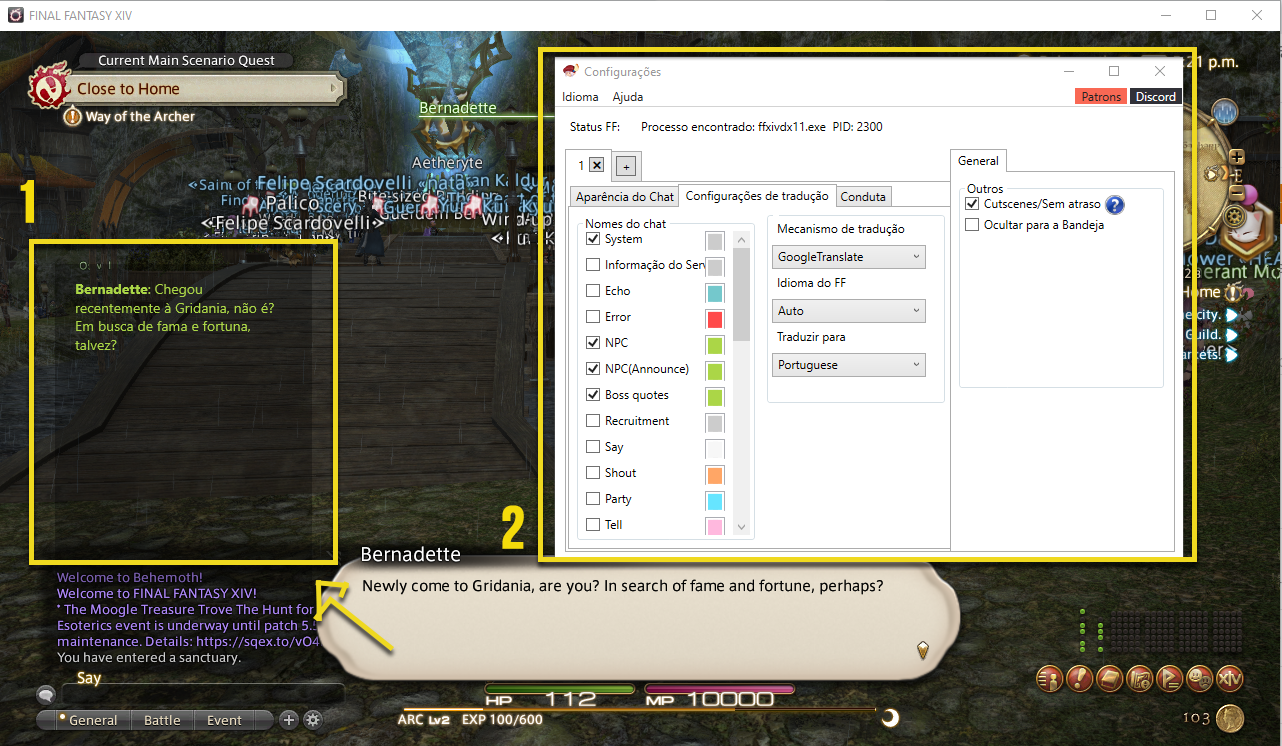 No quadro “1” temos a tradução do diálogo que estava acontecendo entre eu e minha amiga NPC Bernadette. Perceba que no quadro do jogo está em inglês e no quadro onde selecionei em amarelo está a tradução. Você pode mover o quadro, mudar a transparência dele e cor da maneira que ficar melhor para você.