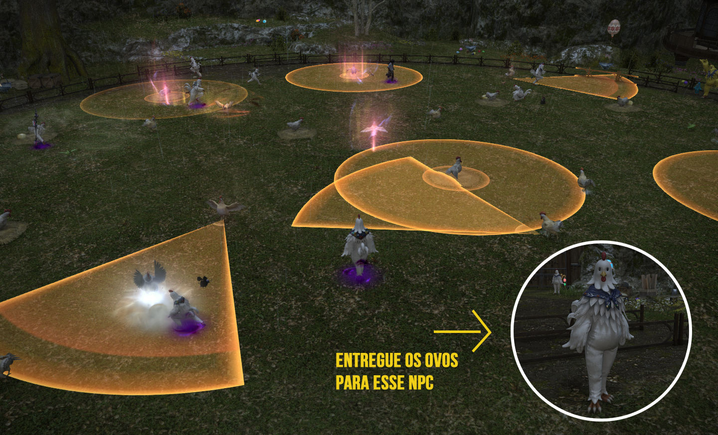 A segunda parte do evento consiste em realizar um FATE com o objetivo de coletar ovos, mas sem levar dano da galinha que está protegendo os ovos. Pegue os ovos e entregue para o NPC que fica no local do FATE. Um detalhe importante é que assim que começa o Fate é preciso sincronizar o level caso você esteja com o nv acima da missão (nv 15).