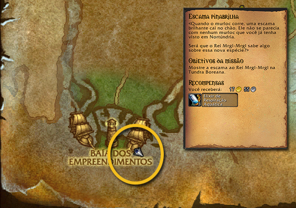 Para iniciar a missão vá até o mapa Serra Gris em Nortúndria, nas coordenadas /way 18.4 88.2, em cima de um iceberg você irá encontrar um Murloc, que ao se aproximar ele irá fugir deixando a quest “Escama Pinabrilha” . Caso não tenha nada no local, é só aguardar alguns minutos que aparece a quest para aceitar.