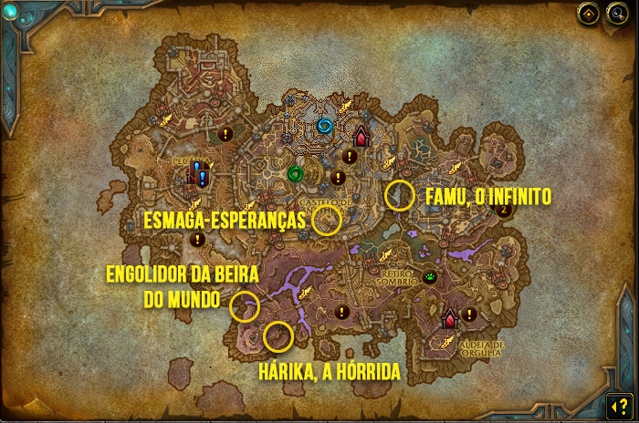 O raro fica nas coordenadas e para evoca-lo primeiro você precisa ter liberado o Condutor de Ânima e direciona-lo para o Monte da Decrepitude. Feito isto vá até as coordenadas /way 42.73, 73.39 e pegue a Seta da Cova. Leve o item até o NPC Esmagasa que fica nas coordenadas /way 46.29, 77.76. Depois de falar com o NPC ele irá ativar o raro que é bem simples de solar. Ela tem chances de dropar a montaria Terrorasa Hórrido.